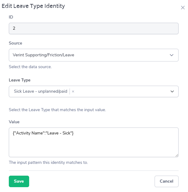 To view or edit a Leave Type Identity, click on the Id number in the first column of the table above, which will open the detail panel below: