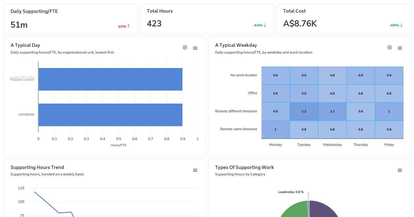 Heat map displaying daily supporting hours/FTE by weekday and a customizable area/grouping