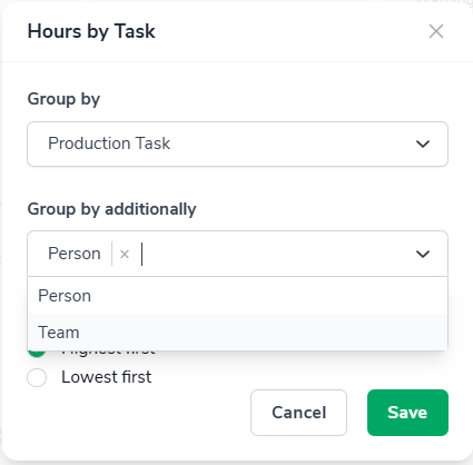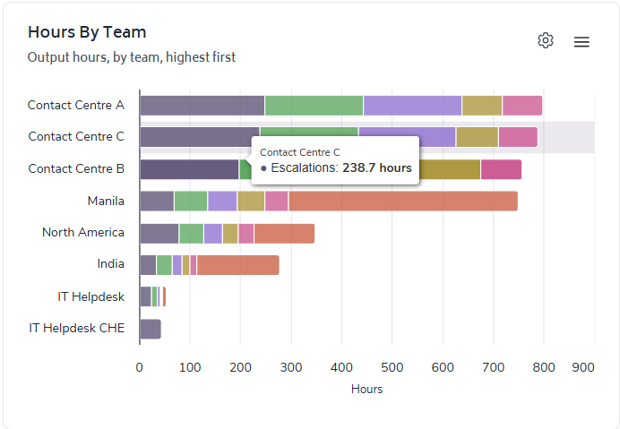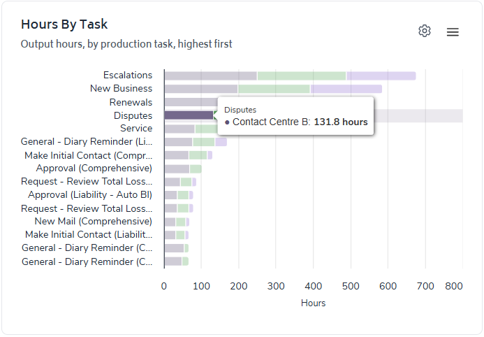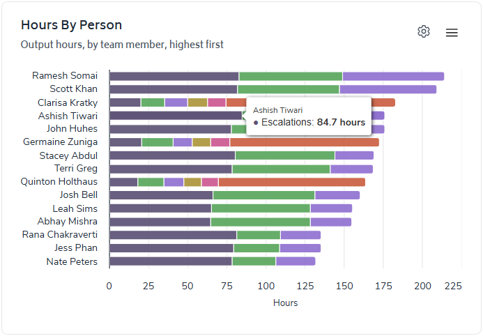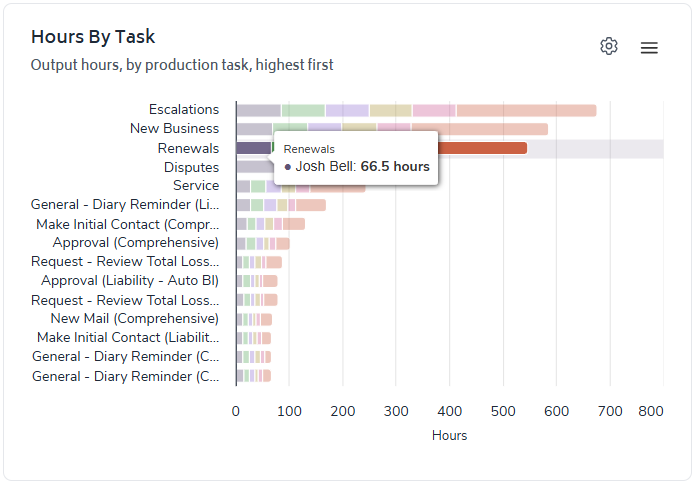 This allows you to view the breakdown of the bars in the chart and not just the totals. Once selected in either chart, the bar will then be broken down to display the 'top 5' and other for each task or person depending on the filtering.