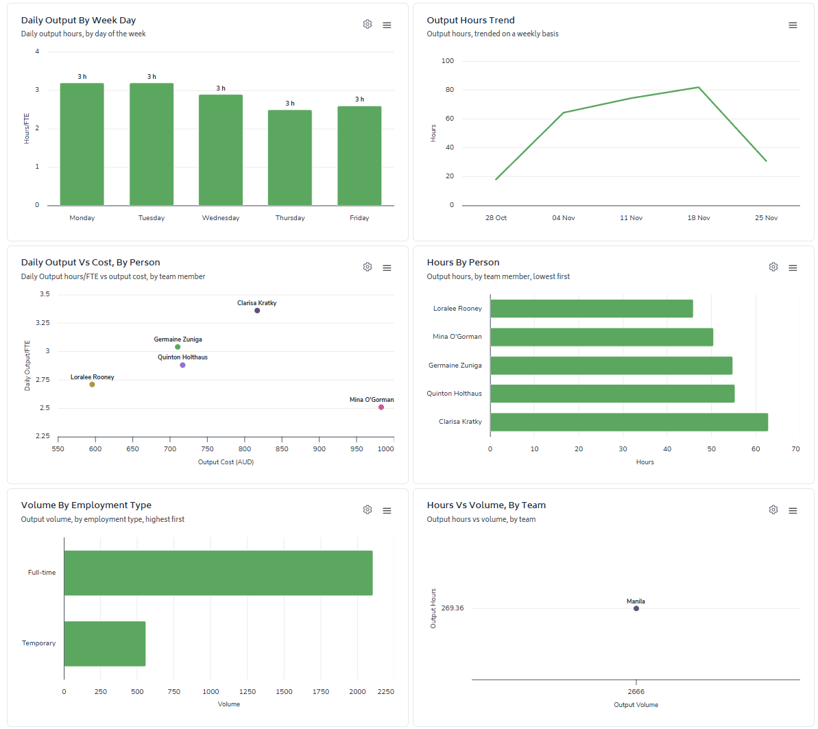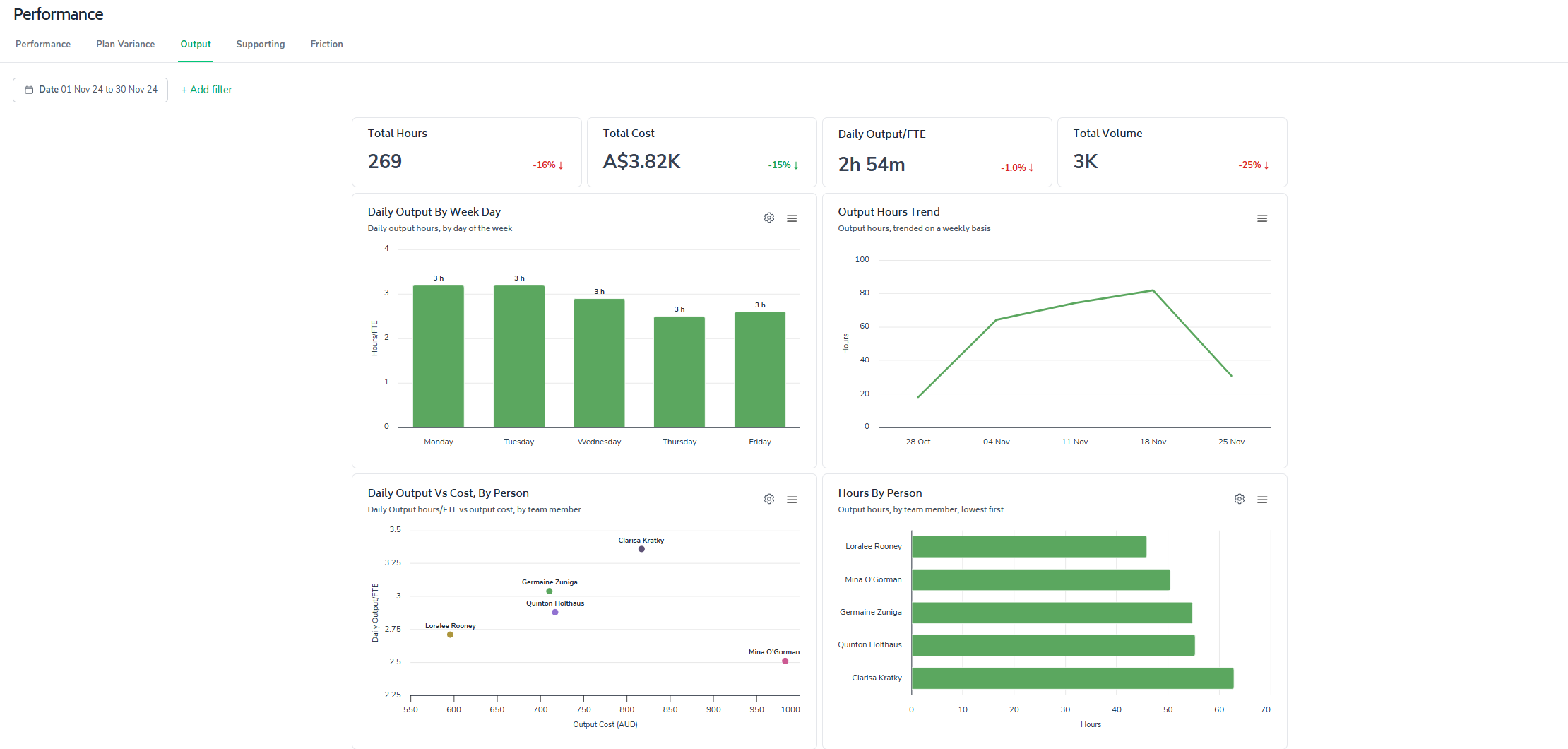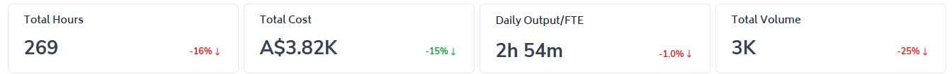 The percentages presented in the bottom-right corner of each card represent the variance when comparing the selected date-range against the most recent historical period. For instance, if you run the Output report over 1-month, the variance presented will display the changes compared to the previous month.