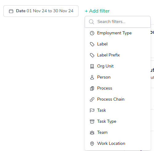 You can filter the report by utilizing any of the elements listed in the '+Add filter' drop-down (pictured below) - this will help you quickly dive deeper into the Output data.