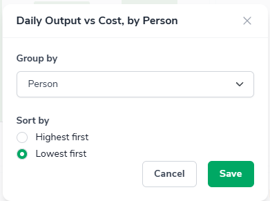 The 'configure-chart' option allows you to group by and in some cases sort highest/lowest first. This can be accessed by clicking the following icon which appears in the top-right of any relevant charts: