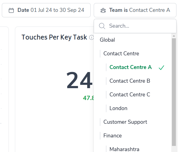 The Dashboard can be run over any date-range and can be filtered to specific departments, teams or groups of teams via the filters in the top-right of screen: