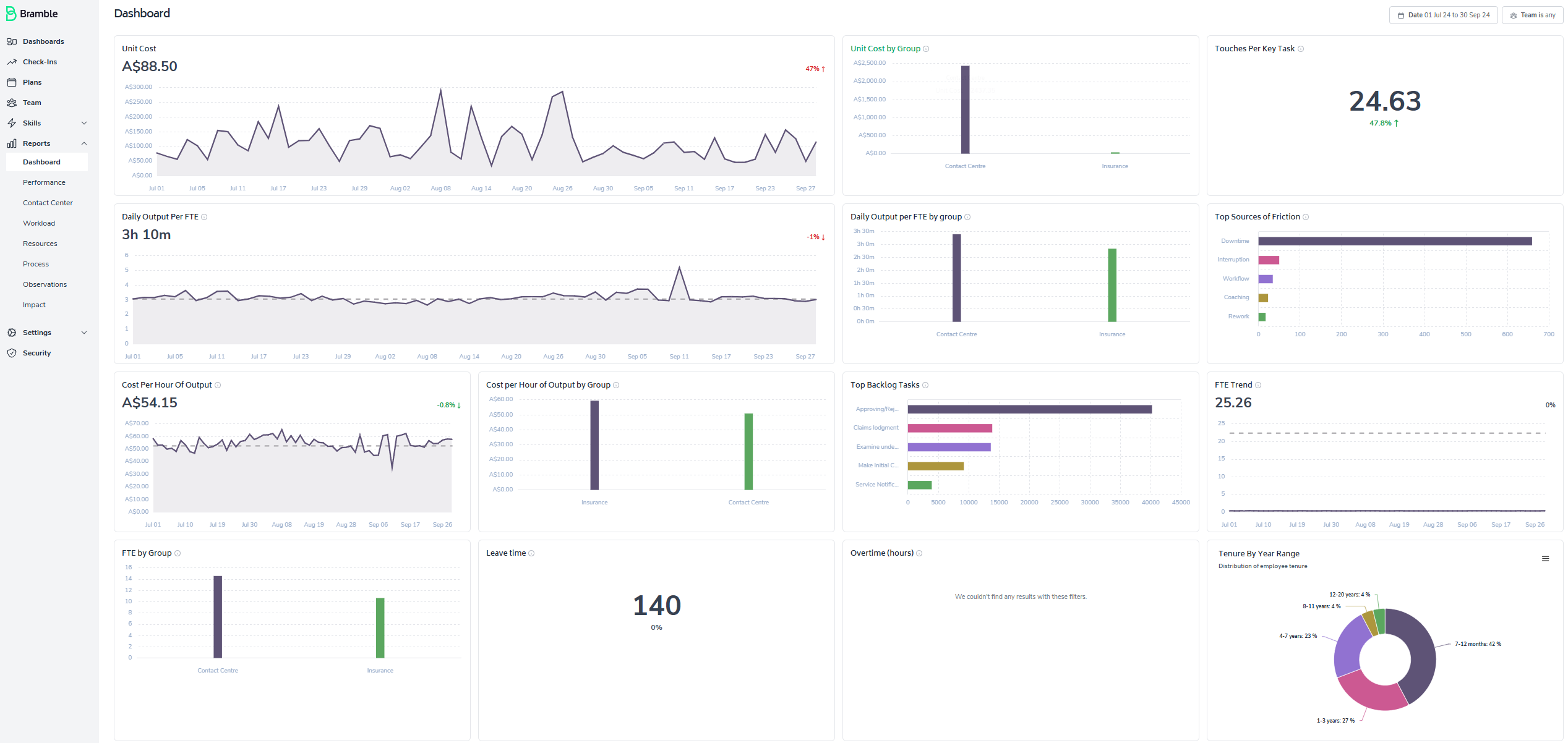 The Dashboard serves as a 'launchpad' for diving into detailed reports within Bramble. Its purpose is to give you a high-level overview of performance across various metrics, enabling you to quickly identify areas that may need deeper analysis and seamlessly navigate to more detailed insights in Bramble.