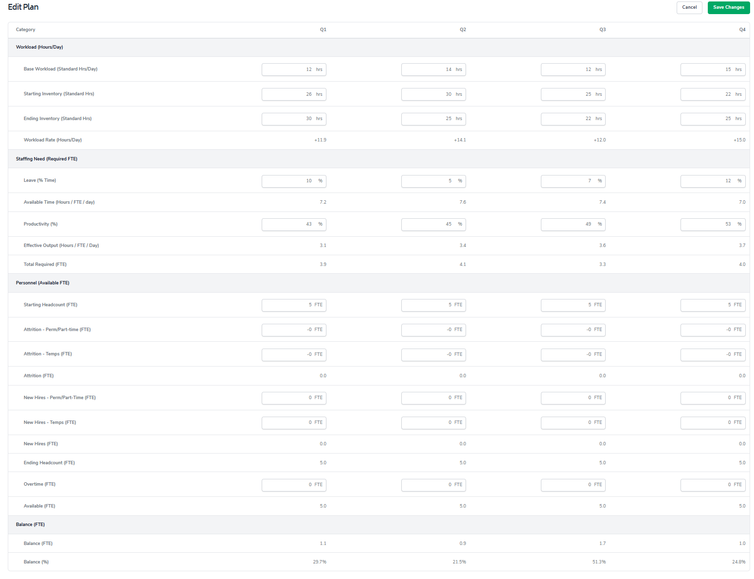 Workforce Plans are edited by quarter, allowing leaders to model changes throughout the year.