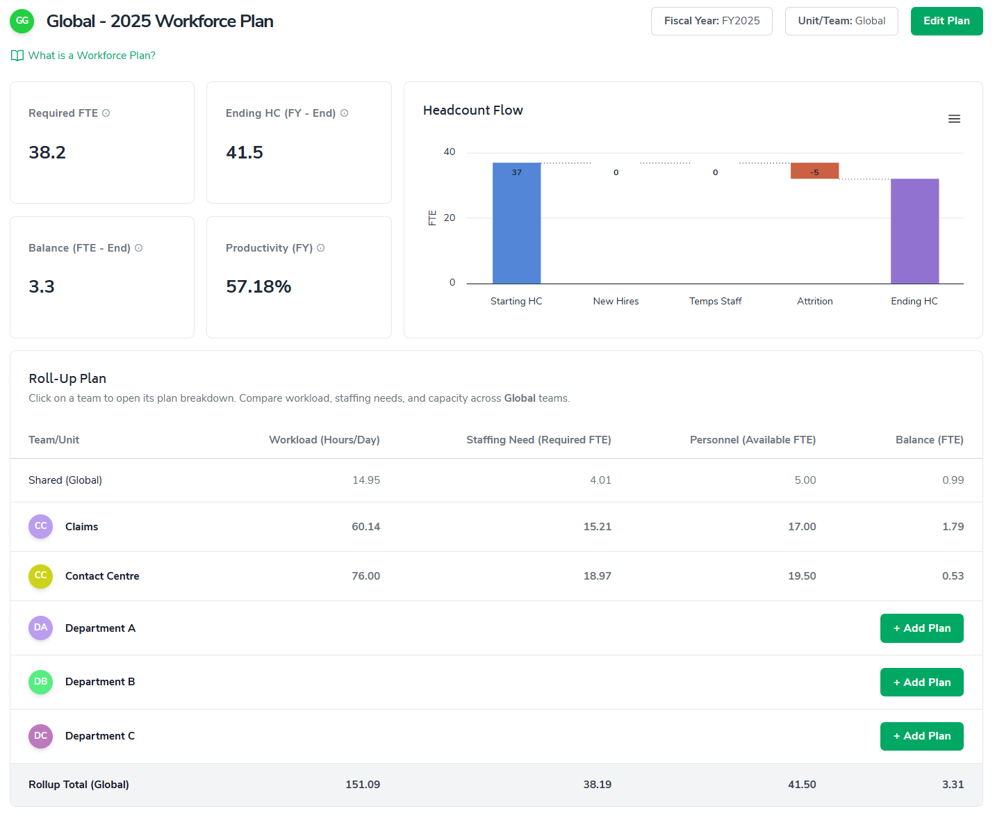 The Roll-Up Plan aggregates Workforce Plans across multiple teams or departments into a single view.