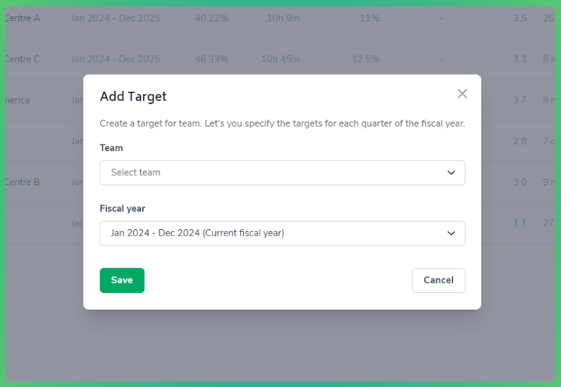 To set targets, an Account Admin/Owner can access them via Teams > Targets. Once there, simply click on the 'Create Target' button in top-right of the page and select the Team and Fiscal Year: