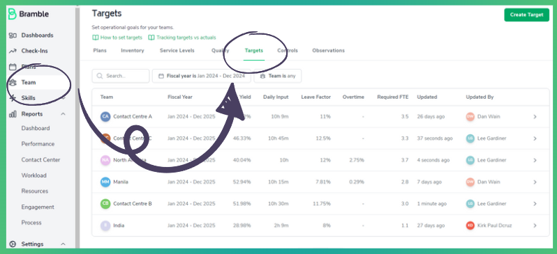 The Targets module in Bramble allows owners to set targets for various operational metrics, such as:
