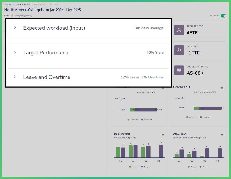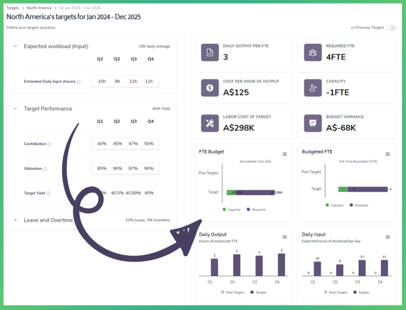 Daily Output Per FTE - average hours of 'Output' for each FTE based on the 'Target Performance' and 'Leave and Overtime'