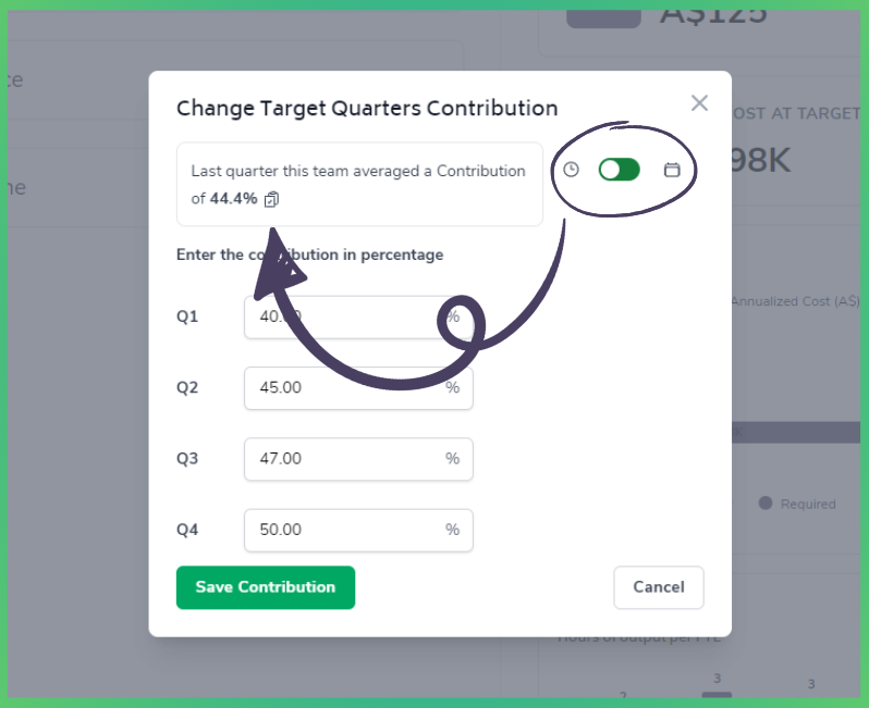 Once you've completed inputting the targets for a given quarter, Bramble will summarize and visualize this in the metric cards and charts to on the right-side of the page including: