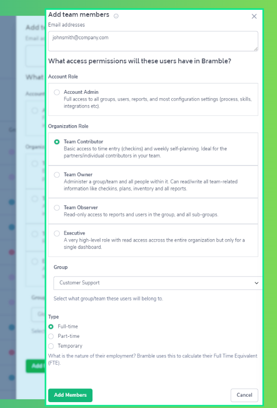 Assign the user to a Group (Team/Department) and set their Access level within Bramble.