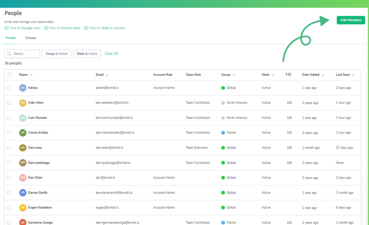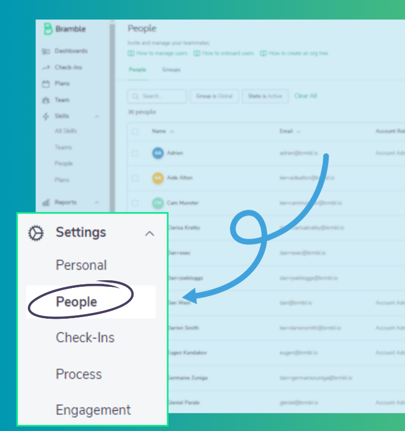 All users with Team Owner. Account Owner, or Account Admin access, are able to create and manage users in Bramble via the menu option Settings>People.