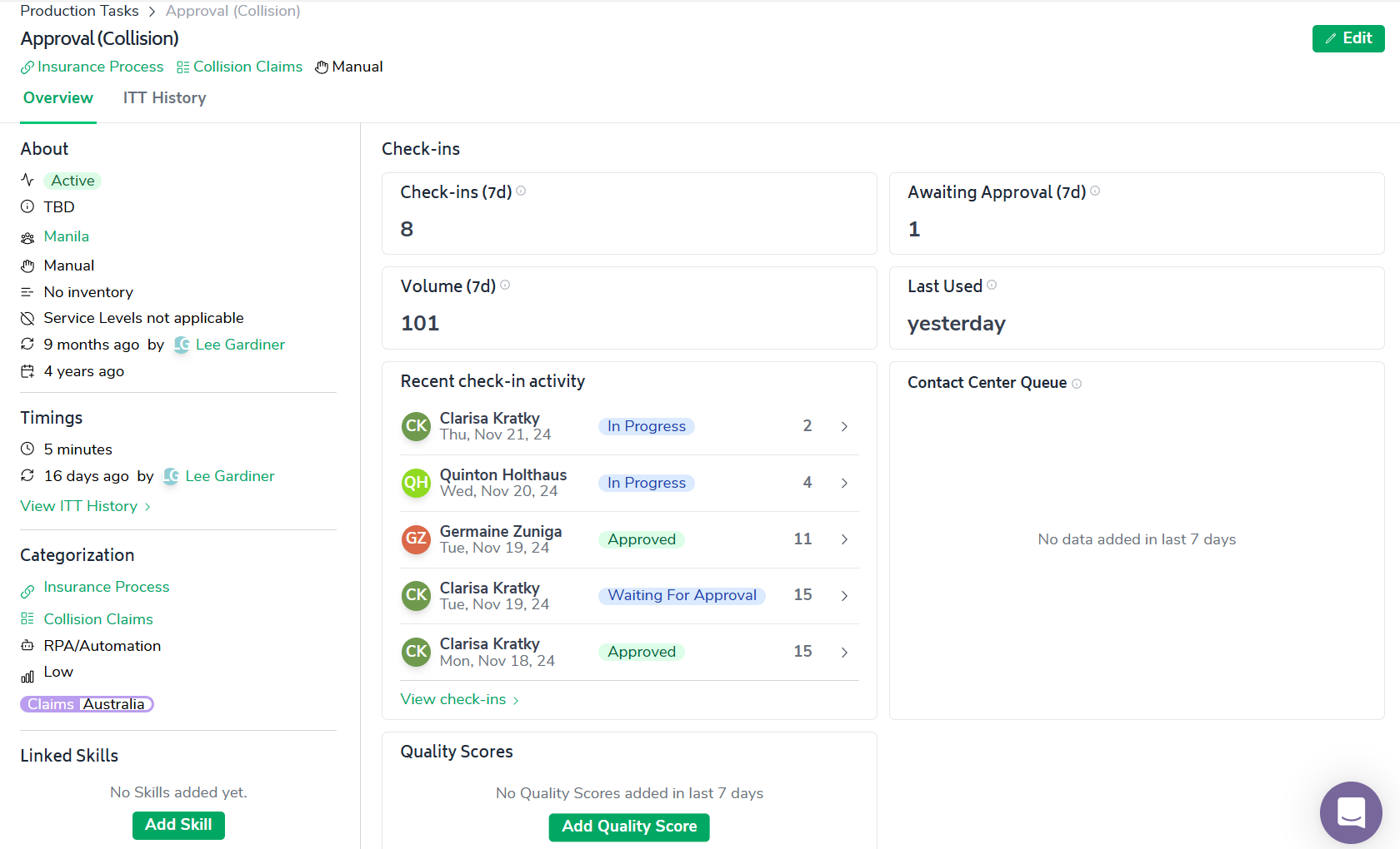 Both types of tasks collectively equate to the output of an individual, team, and department and impact performance metrics. Managers and individual contributors can review performance metrics such as Contribution and Productivity, which are driven by both Manual and Auto Tasks.