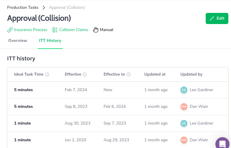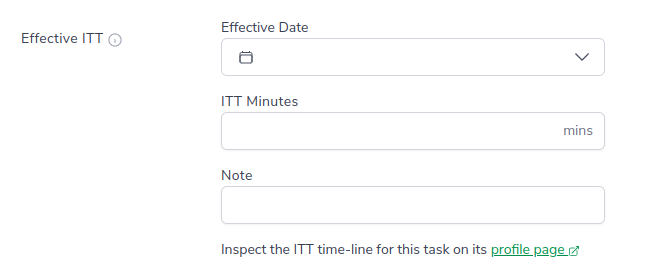 Over time, as you understand how your staff work on a given task, you may want to change the ITT. This is what the Effective Date on an ITT lets you do, preserving any historic ITTs, but allowing you to change it for future work. This allows for you to allow for improvement initiatives that impact the ITTs (i.e. Automation, Process Improvement).