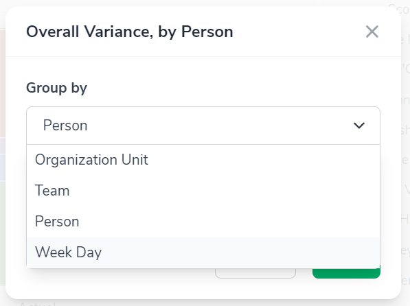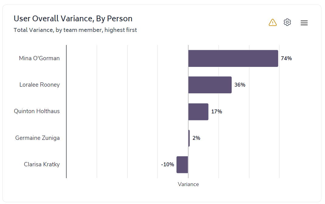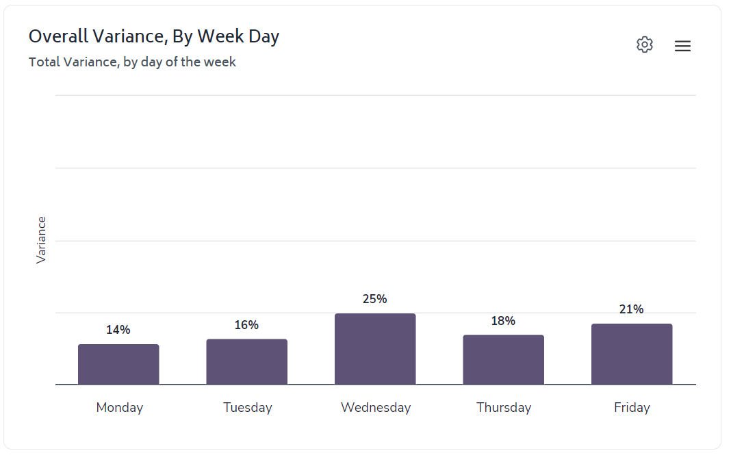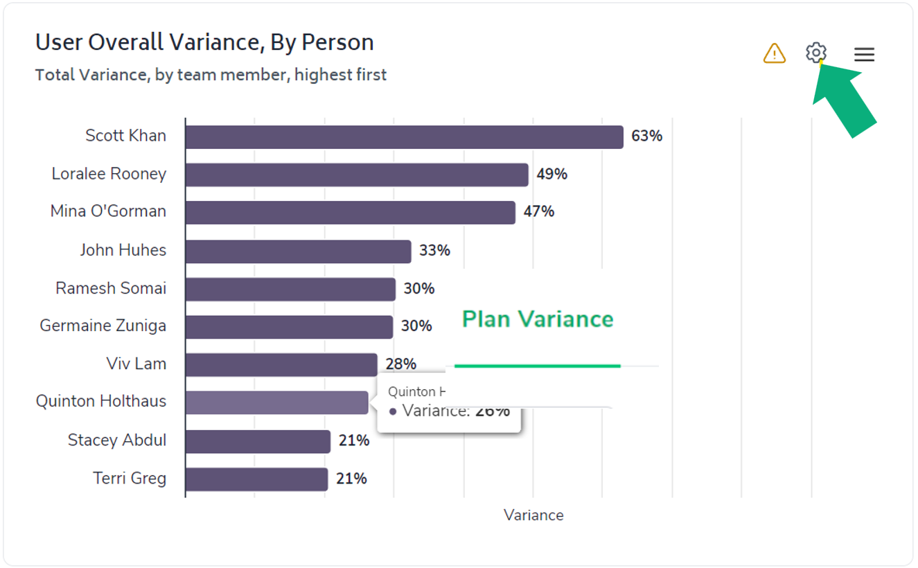 Additionally, you can change the settings for any chart or element in the report whenever you see the 'cog' icon. The series of screenshots below illustrate how we can change the 'User Overall Variance, By Person' chart to view variance by Weekday instead: