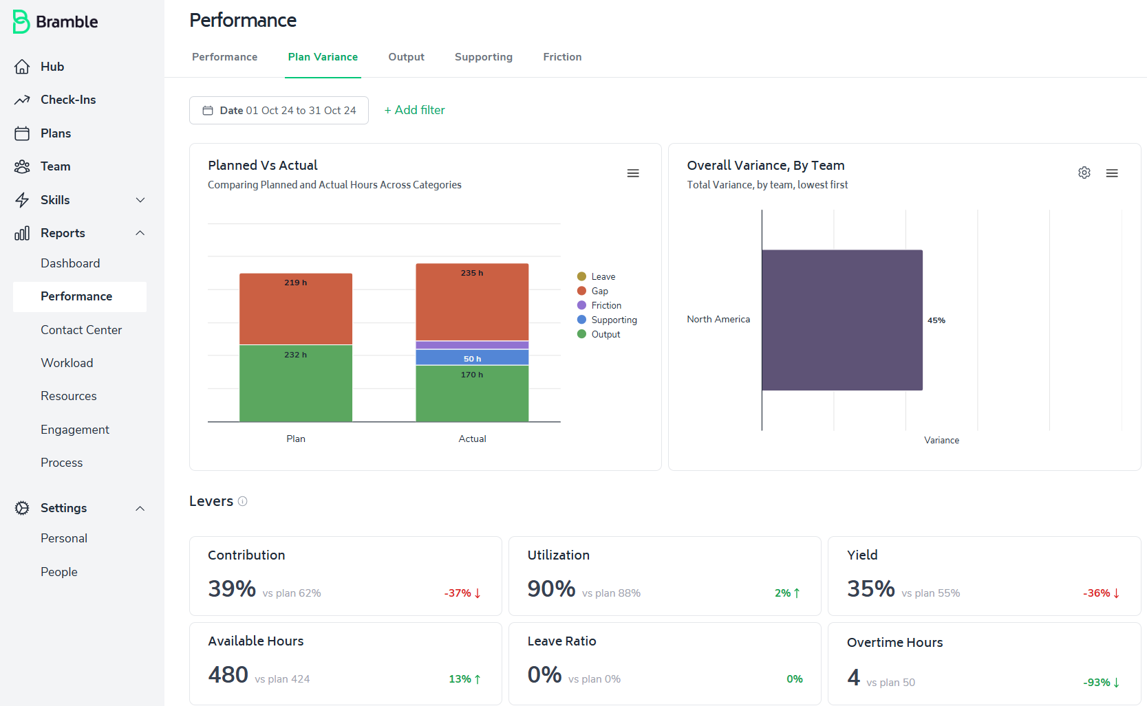 As with all reports in Bramble, you can run the Plan Variance over any selected date-range and depending on your role in the organization, across multiple teams or business units.