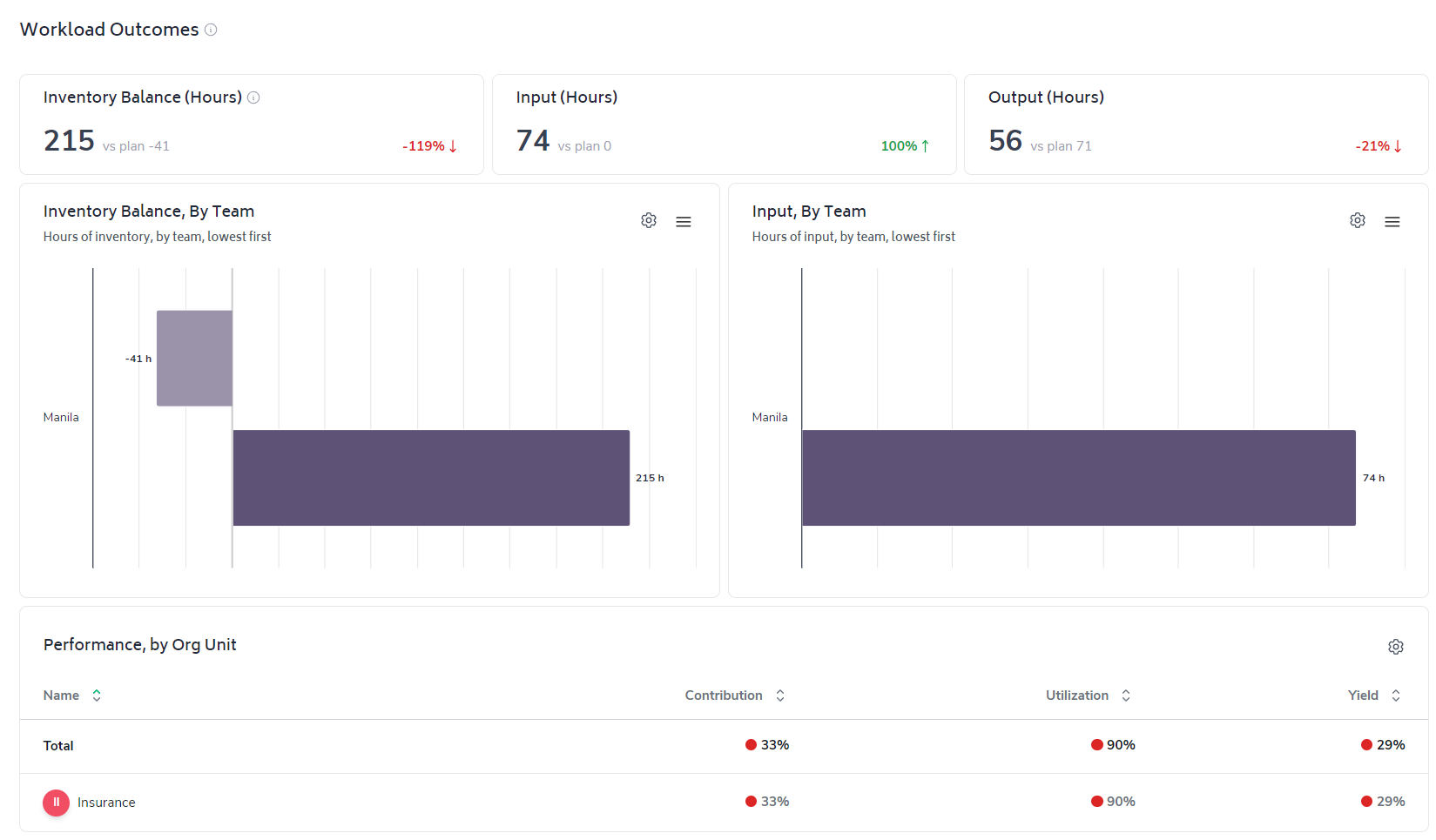 Output is represented by the green element of the chart. In this example we can see that the team produced significantly less output than planned (56h vs 71h). Given that Output is a product of available time, utilization and contribution, and we know that actual available time closely matched planned available time, then the reason behind the lower output than plan can be attributed to either lower contribution, lower utilization or a combination of the two.