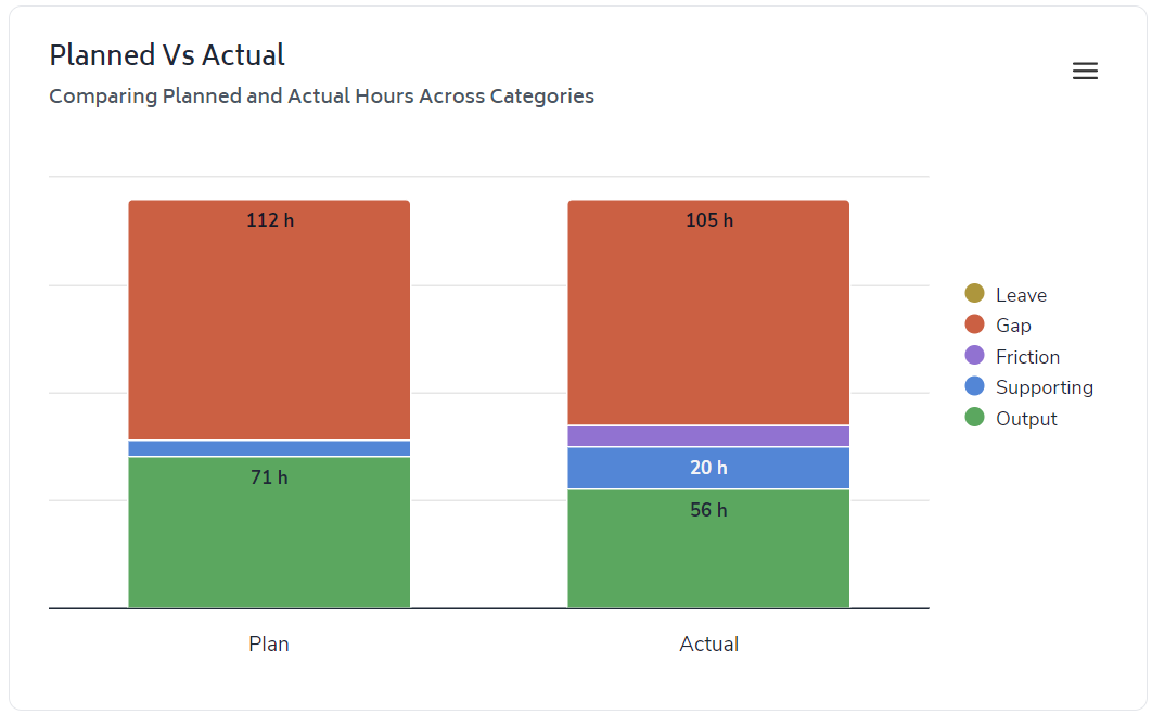 On the left we have a stacked-bar which presents the planned use of time and planned Output over the given date-range. On the right-side we can see what actually occurred.