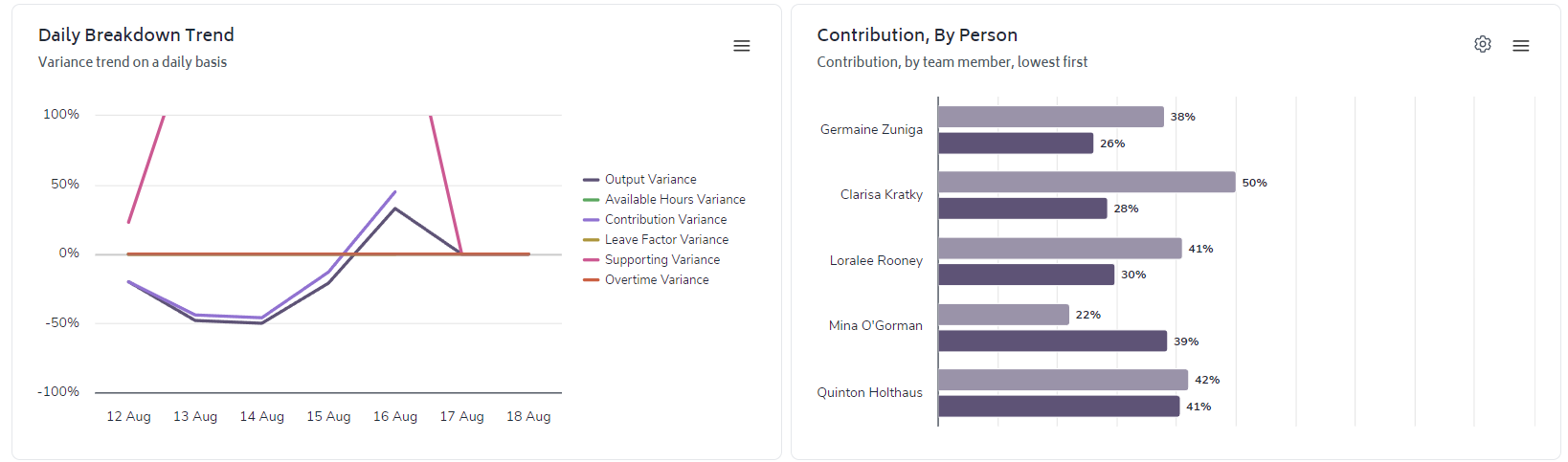 These two charts provide greater context behind any variance in the 'levers.' The Daily Breakdown trend provides a snapshot of variance by metric by date and in the example here, we can see substantial variance between actual time spent on Supporting Tasks against plan - this explains the lower Utilization.