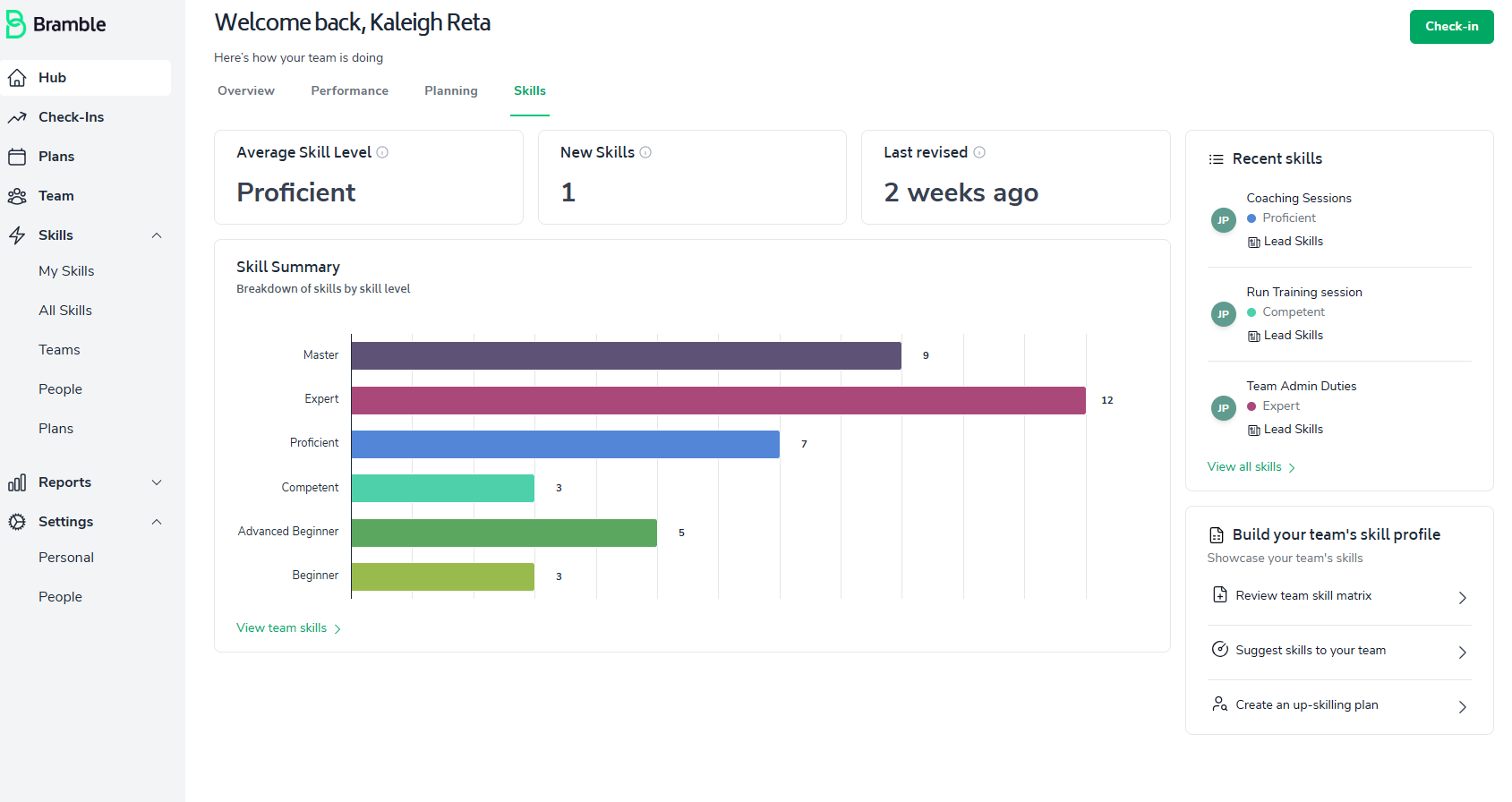 Bramble Skills track an individual's expertise in a particular area. Skills and people's scores are publicly available to encourage sharing and help people find colleagues with necessary skills.