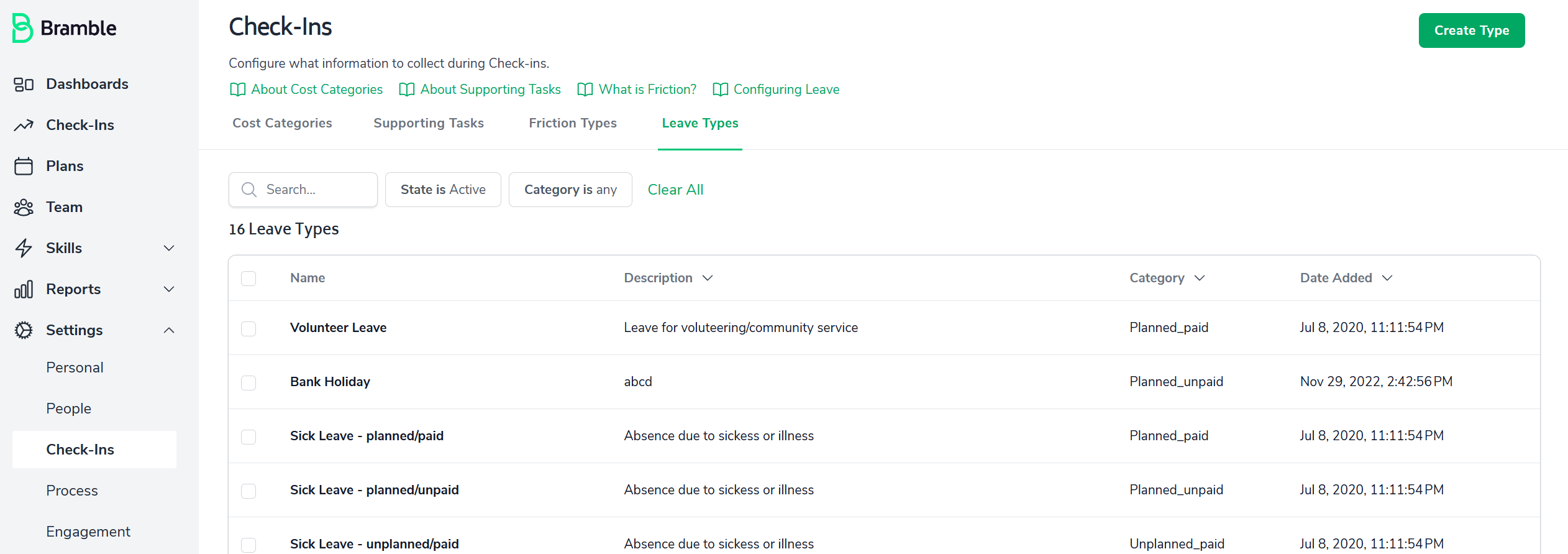 Leave Types may be created by going to Settings > Check-ins > Leave Types and then clicking on Create Type.