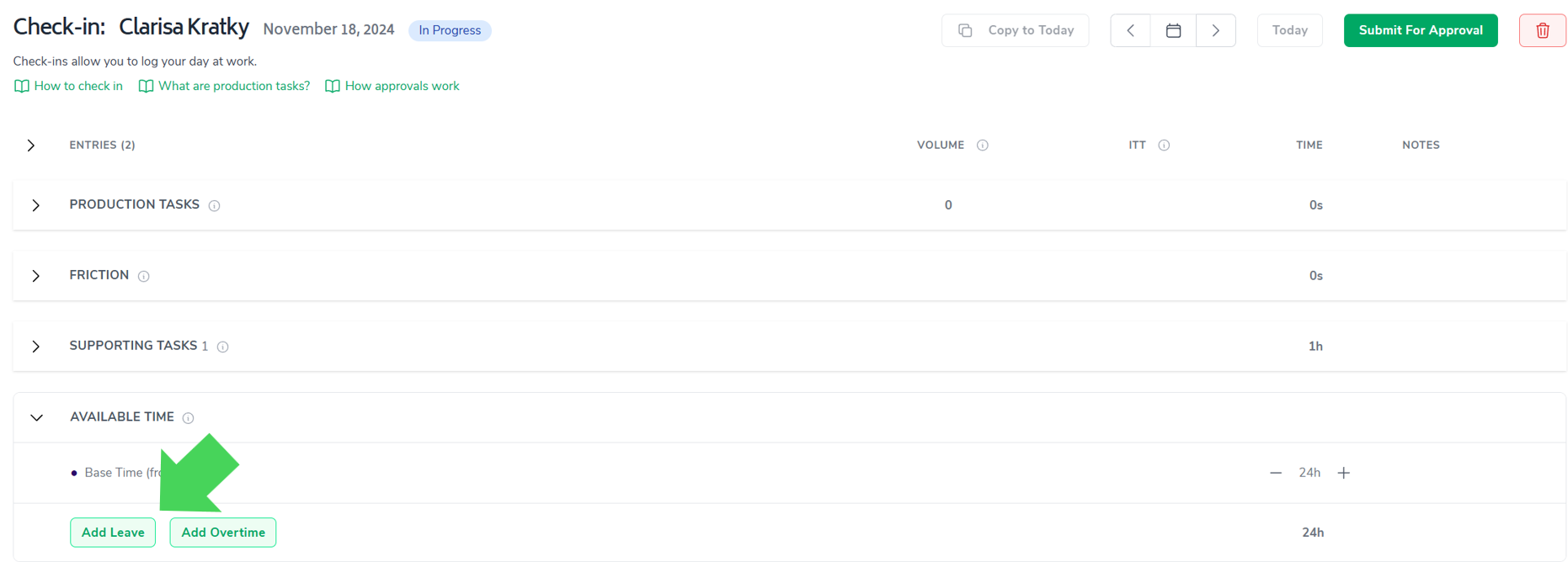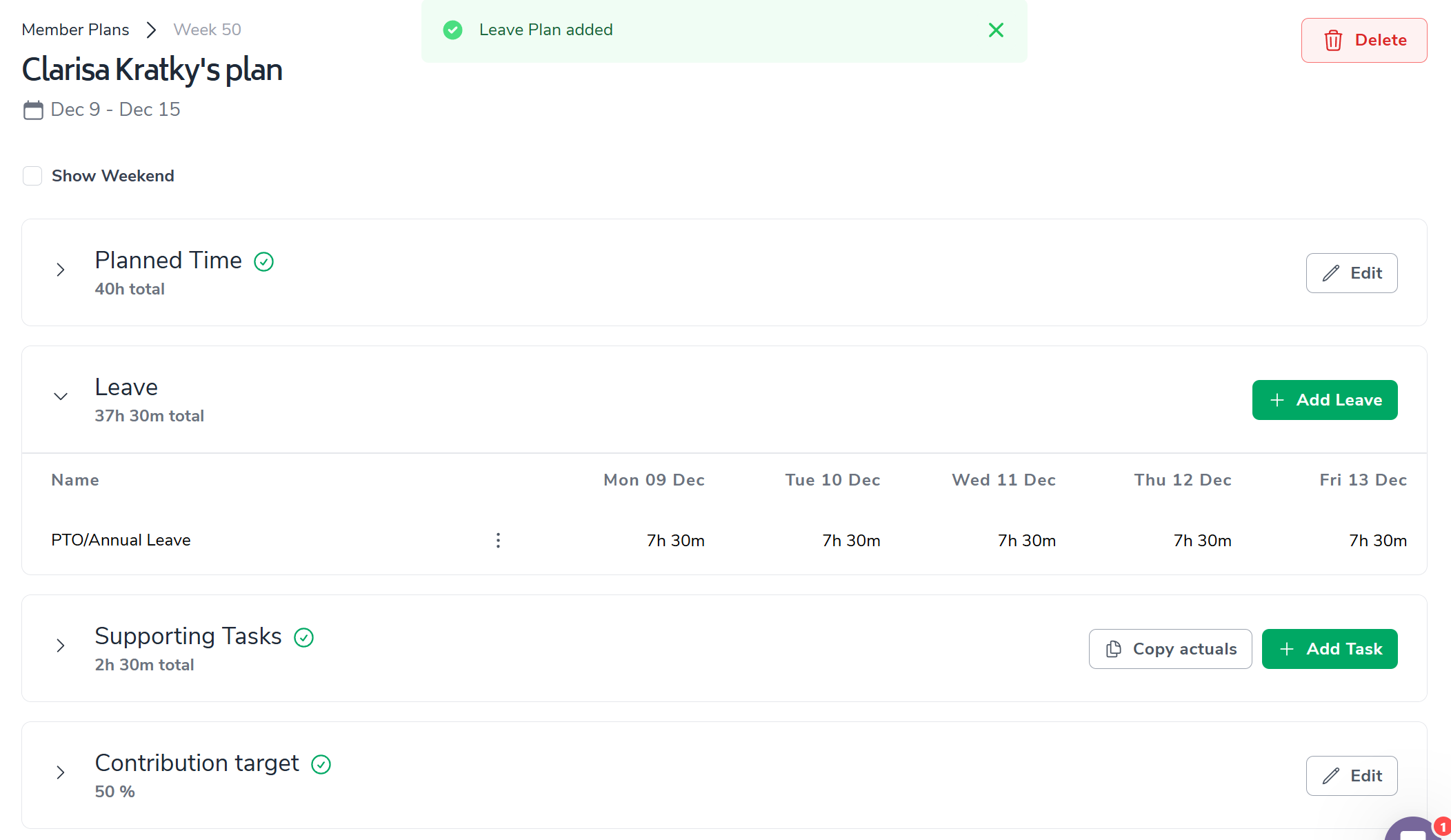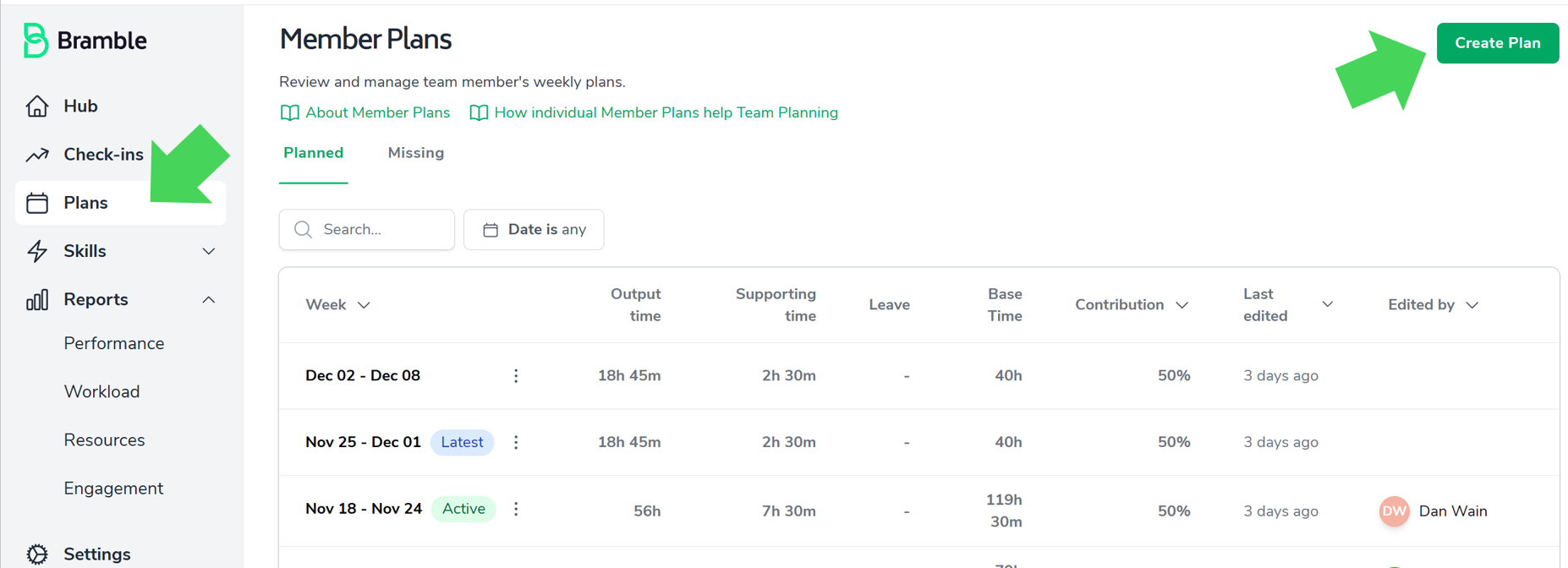 Leave can be added by clicking on "Create Plan" and selecting the week for the plan and saving it (indicated in the screenshot above)