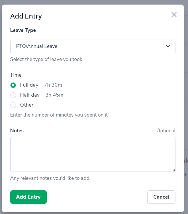 Select the type of leave and duration from the pop-up (notes are optional):