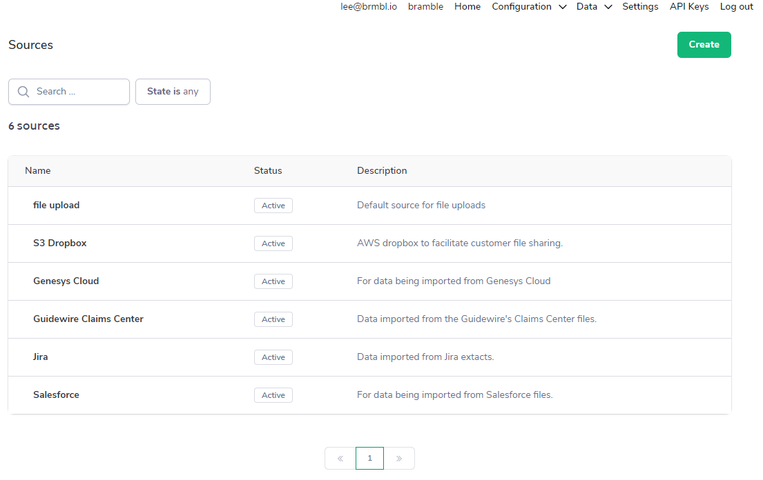 This screenshot displays the Sources that have been configured for a range of systems this customer has elected to integrate with Bramble.