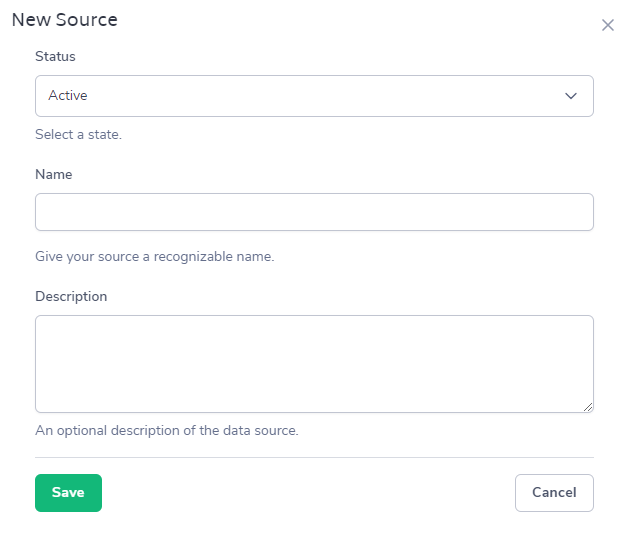 Choose the Status - options are are Suspended, Active, and Archived. Select the Active status when creating a new Source.