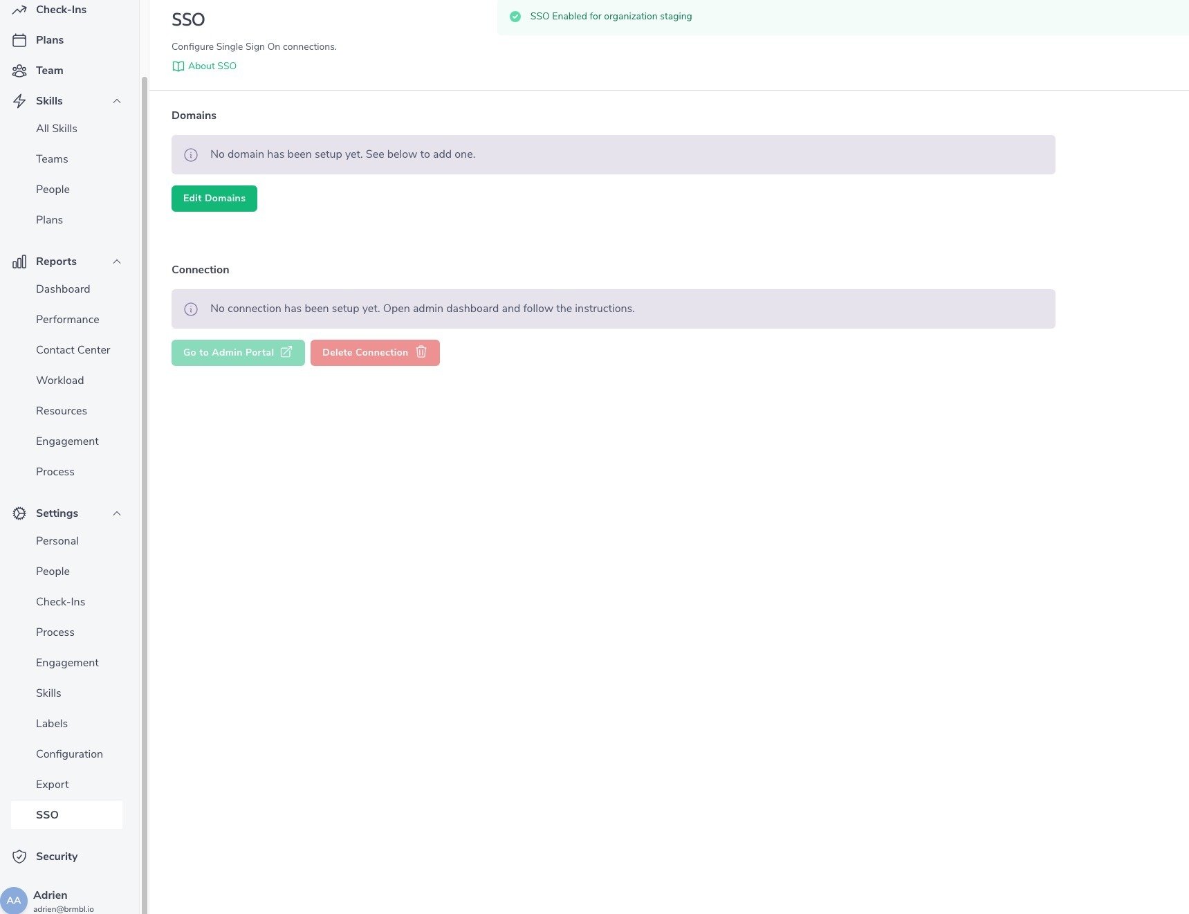 As an account owner, click on "SSO" in the "Settings" section of the left side menu.