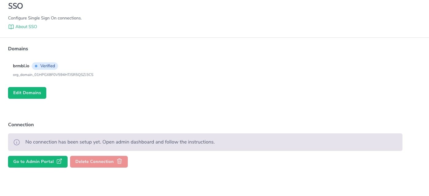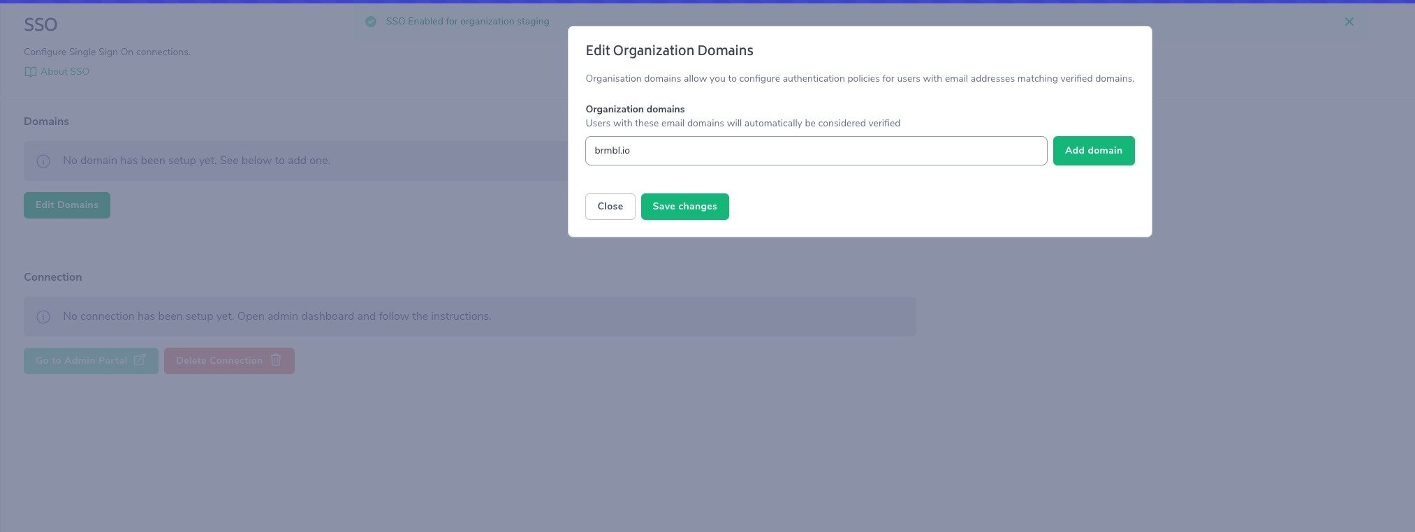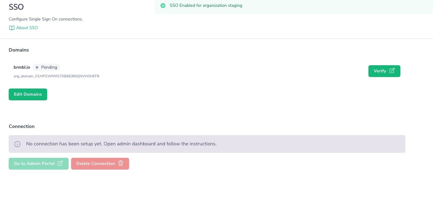 Click "Verify" for each domain you created. It will open an assistant giving you the TXT record to be added to your DNS configuration for the typed domain name. Once it successfully checks that your setup is correct, you can come back to Bramble's SSO settings page.