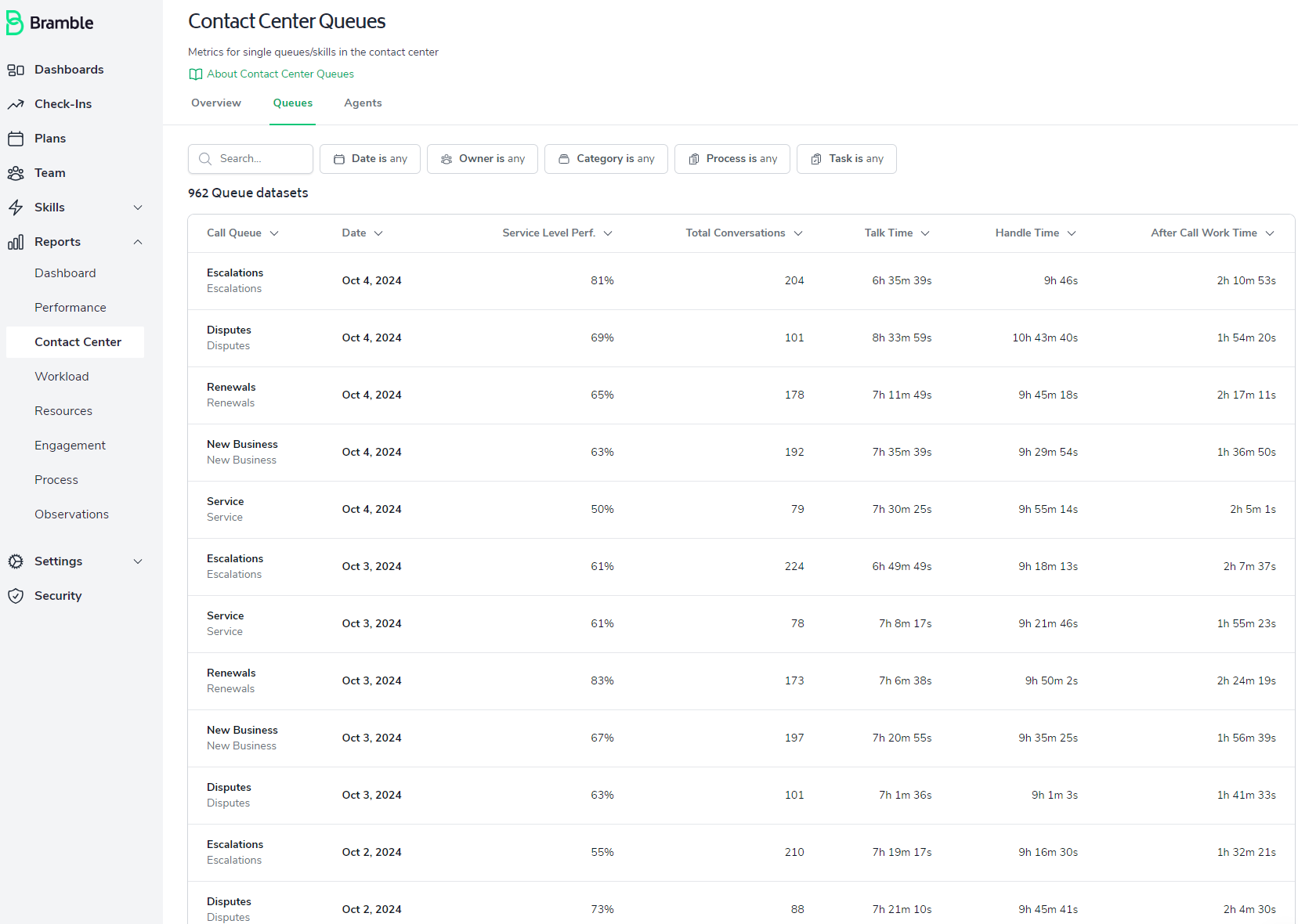 As mentioned at the beginning of this article, these reports are simply displaying metrics imported from your organizations' telephony system. While the ability to filter these reports provides a level of fidelity when viewing these reports, the Overview combines Bramble metrics with telephony metrics that provides daily insight into team and individual performance.