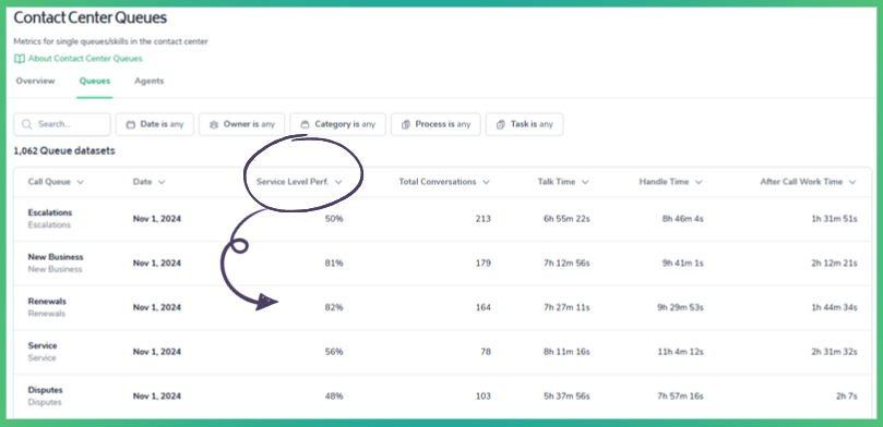The key with this metric is balance, as achieving a very high service level % can be an indication of over-resourcing. Achieving and maintaining a satisfactory service level requires careful monitoring of call volume, agent availability, and call handling times, along with adjustments to staffing and processes as needed.