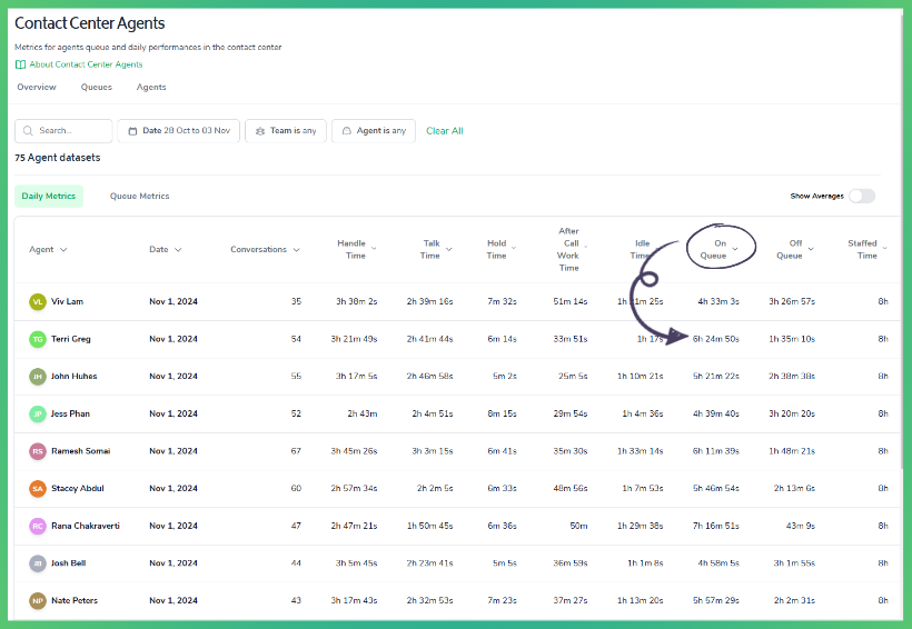 Available time is also known as 'On Queue' time in Bramble, and appears on the Agent Daily Metrics table. It includes: